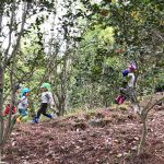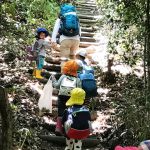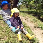 年少さんは、自分の荷物を背負って歩くこと、お弁当、雨の日の活動…いしころえんでの毎日に一生懸命ついていく。その中でも自然物への好奇心は止まらなくて、でもお兄ちゃん達にさえぎられて煮え切らない体験もしたりしながらも、だんだん遊びなれてきました。
